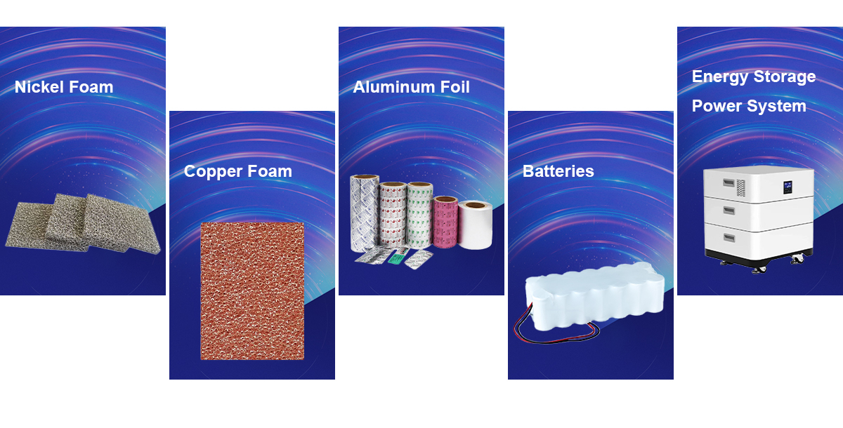 Prodotti principali: Schiuma di nichel, schiuma di rame, foglio di alluminio, batterie, sistema di accumulo di energia